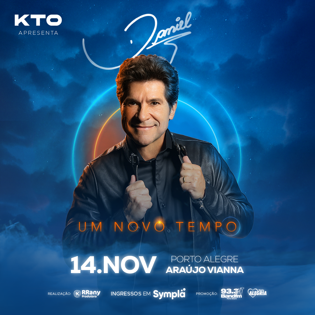 Após o sucesso do projeto que celebrou quatro décadas de história, o cantor Daniel retorna aos palcos com uma nova proposta: mais intimista, emocional e cheia de significado. No dia 14 de novembro, o artista se apresenta no Auditório Araújo Vianna, em Porto Alegre, com o espetáculo “Um Novo Tempo”, em formato acústico, com nova roupagem para os clássicos.